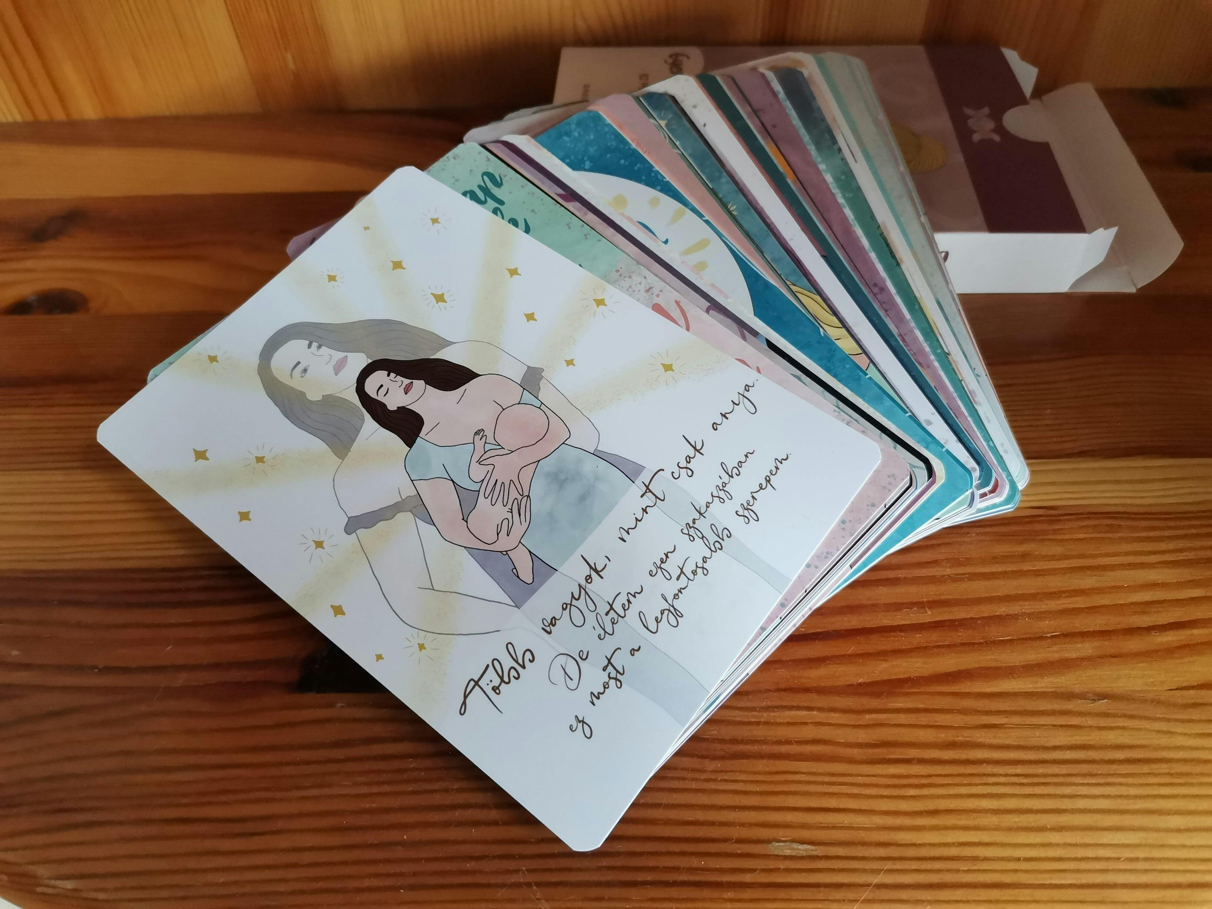 Az Istennők kártya csomag megerősítései nagyon sokat adnak, hogy Édesanya mellett NŐ is maradhassak. Különböző workshopokra, eseményekre is viszem magammal.